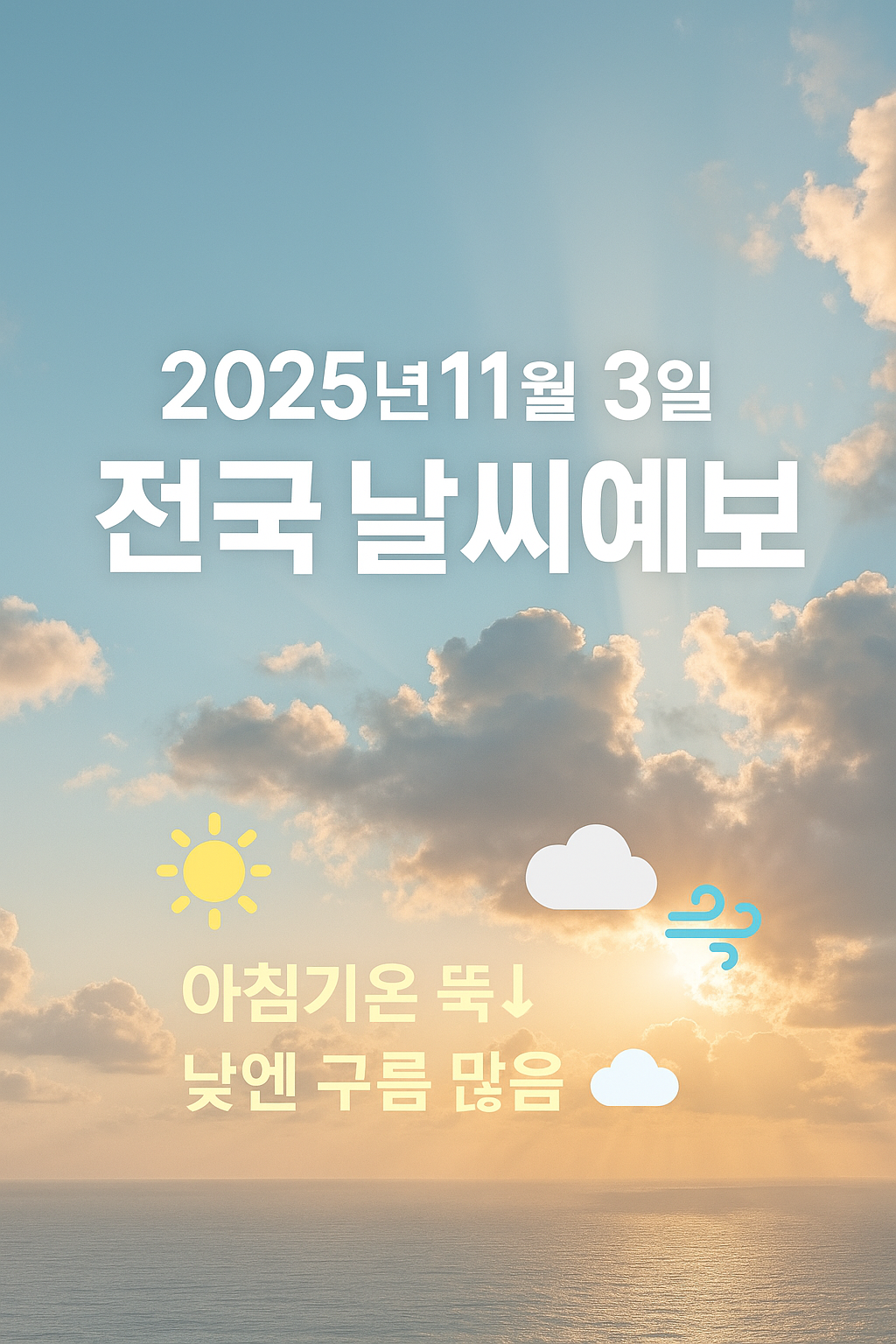 안녕하세요! 2025년 11월 3일(월) 전국의 날씨를 함께 살펴볼게요. 아침에는 낮 기온이 꽤 내려가면서 체감이 쌀쌀하게 느껴질 수 있고, 낮 시간대에는 구름이 많아져서 햇살보다는 흐림 느낌이 강하겠습니다.