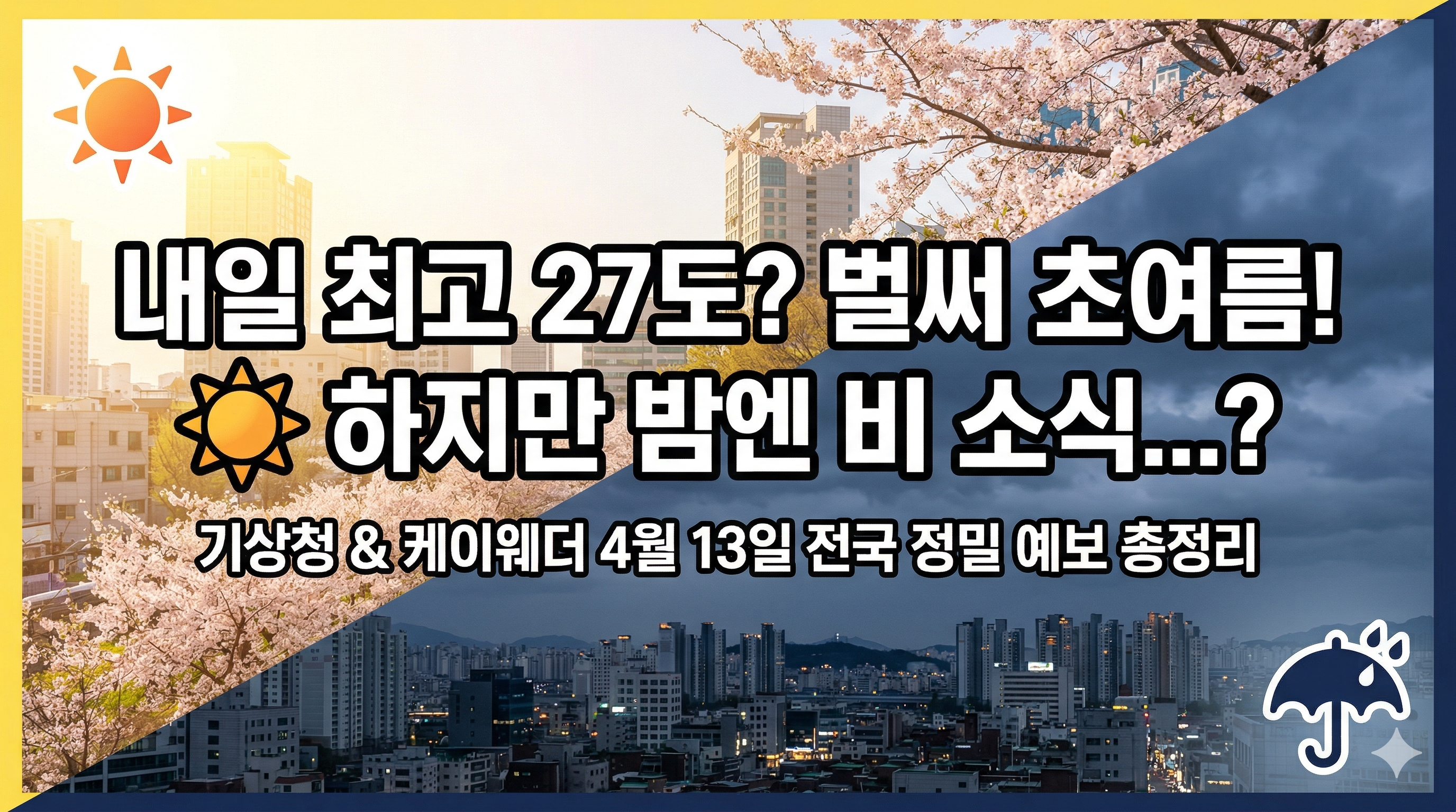 안녕하세요! 월요일 출근길을 준비하시는 여러분을 위해 2026년 4월 13일의 따끈따끈한 날씨 정보를 들고 왔습니다. ☀️ 이번 월요일은 맑은 하늘로 시작해 낮에는 초여름 수준의 더위가 찾아오겠는데요, 밤부터는 남부 지방을 중심으로 비 소식이 있으니 끝까지 확인해 주세요!