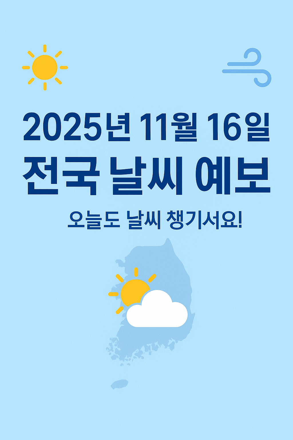 안녕하세요 🙂 오늘 2025년 11월 16일 하루, 전국의 날씨를 함께 살펴보겠습니다. 저기압과 찬 공기의 영향은 적지만, 밤사이 기온이 떨어지고 낮·밤의 차가 꽤 큰 날이 될 전망이에요.