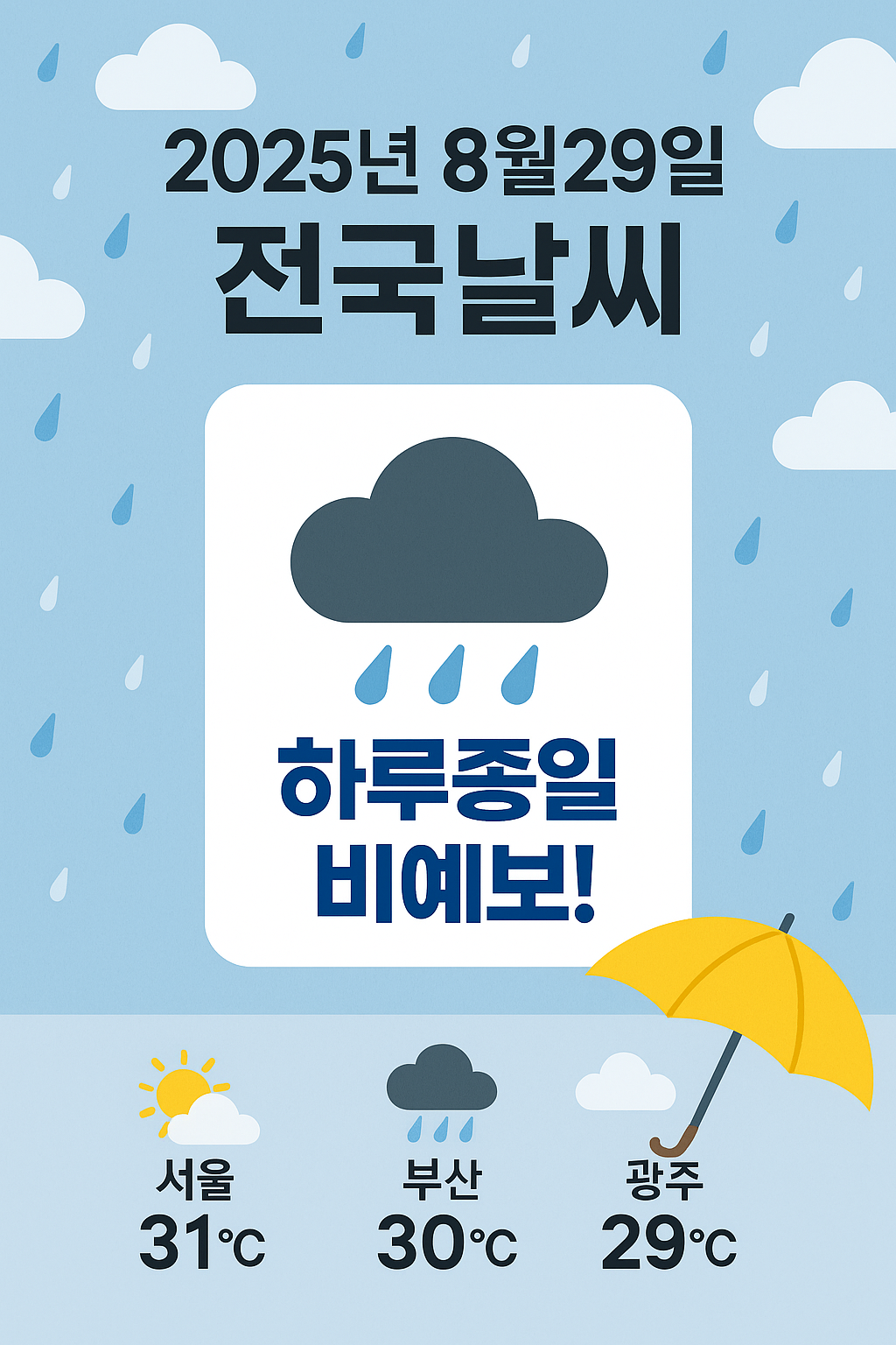 8월 29일 전국은 흐림과 비가 섞일 전망입니다. 중부·남부 지방 곳곳에 강수 예보가 있습니다. 우산은 필수! 기온은 27.6~31.8℃까지 오르고, 강수량은 지역에 따라 최대 50mm 예상됩니다[9][3].
