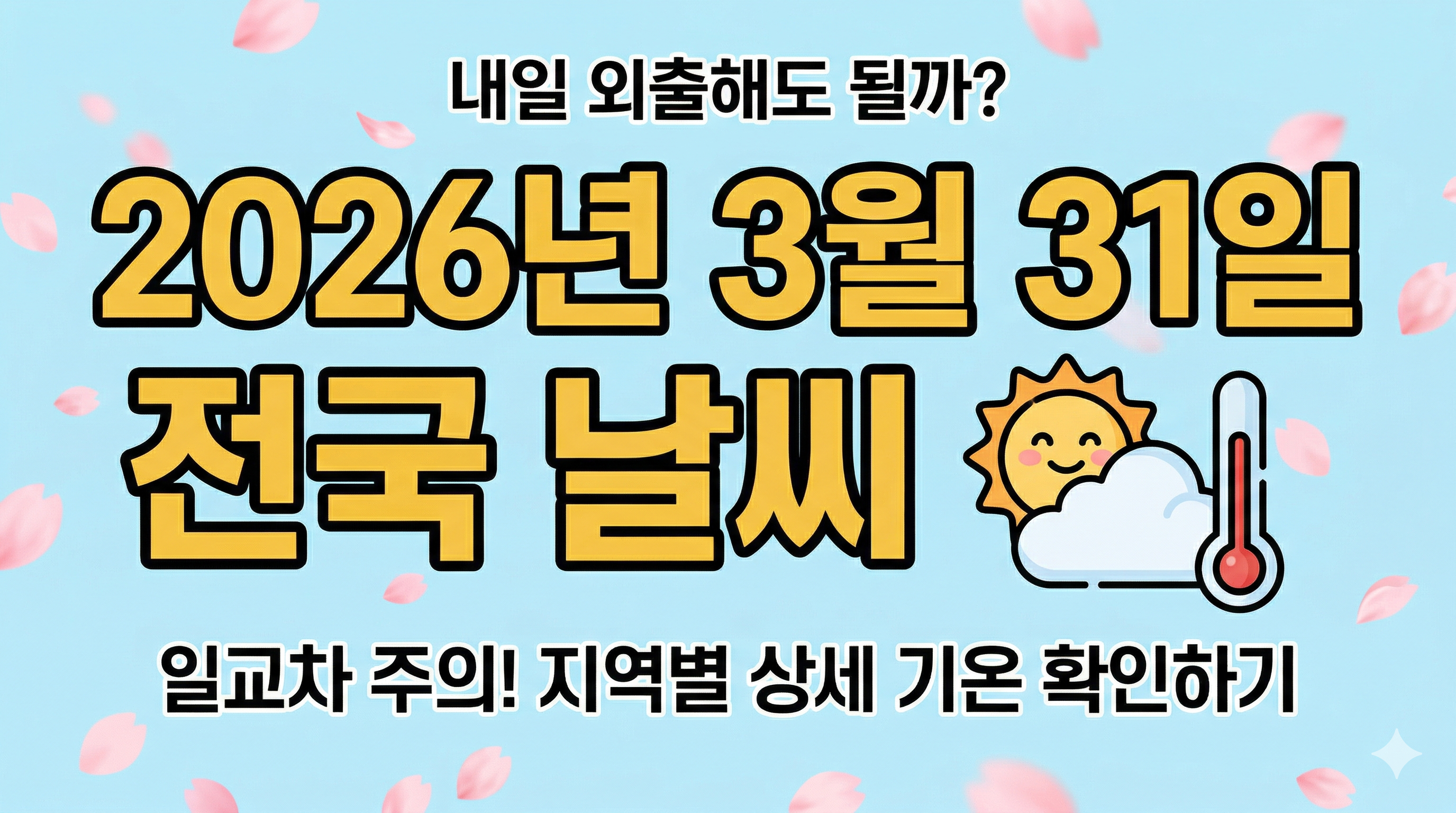 안녕하세요! 벌써 3월의 마지막 날인 3월 31일이 다가왔습니다. 🌸 내일은 고기압의 영향으로 전국이 대체로 맑겠으나, 중부 지방은 오후 한때 구름이 많아지는 곳이 있겠습니다.