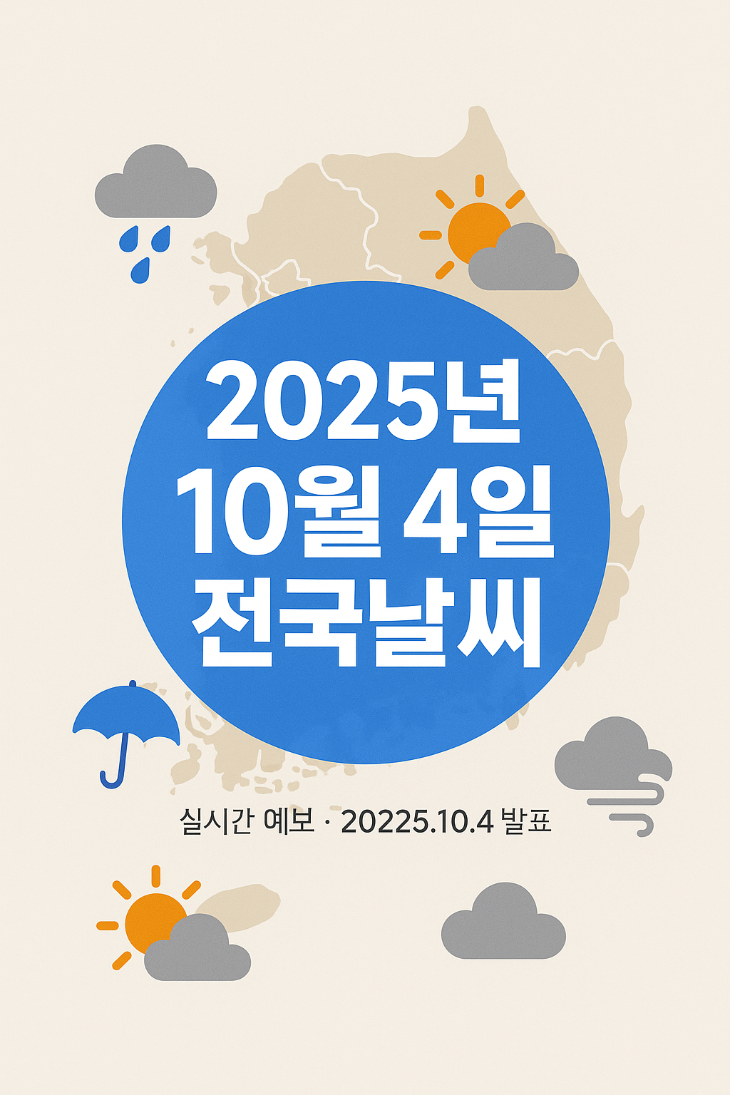 안녕하세요! 기상청 날씨누리와 케이웨더에서 직접 확인한 2025년 10월 4일 전국 실시간 날씨 예보입니다. 오늘은 전국 대부분 지역 흐림이며, 충청권과 남부내륙, 제주도, 경상권 일부에 비가 올 전망입니다. 비구름이 오전까지 머무르다 낮에는 소강상태를 보일 것으로 분석됩니다.