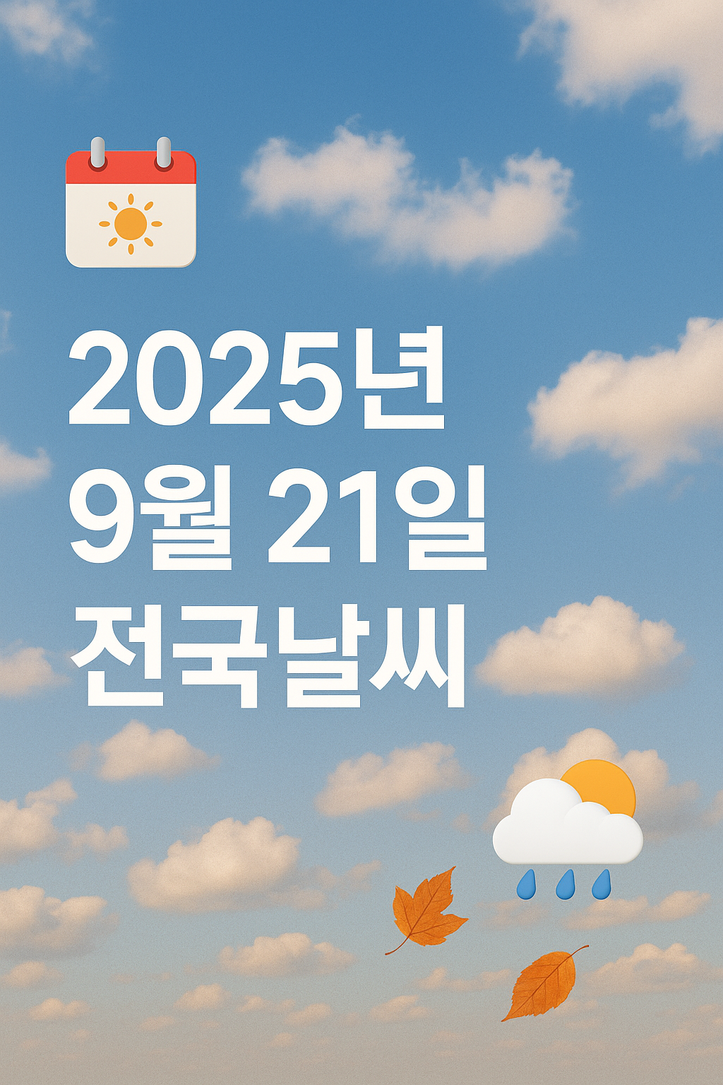 안녕하세요! 오늘은 2025년 9월 21일 전국 날씨 정보를 기상청 날씨누리와 케이웨더의 예보를 바탕으로 카드뉴스 형식으로 정리해 드릴게요. 가을로 접어든 이번 주말, 비와 구름 소식이 엇갈리니 꼭 확인하세요!