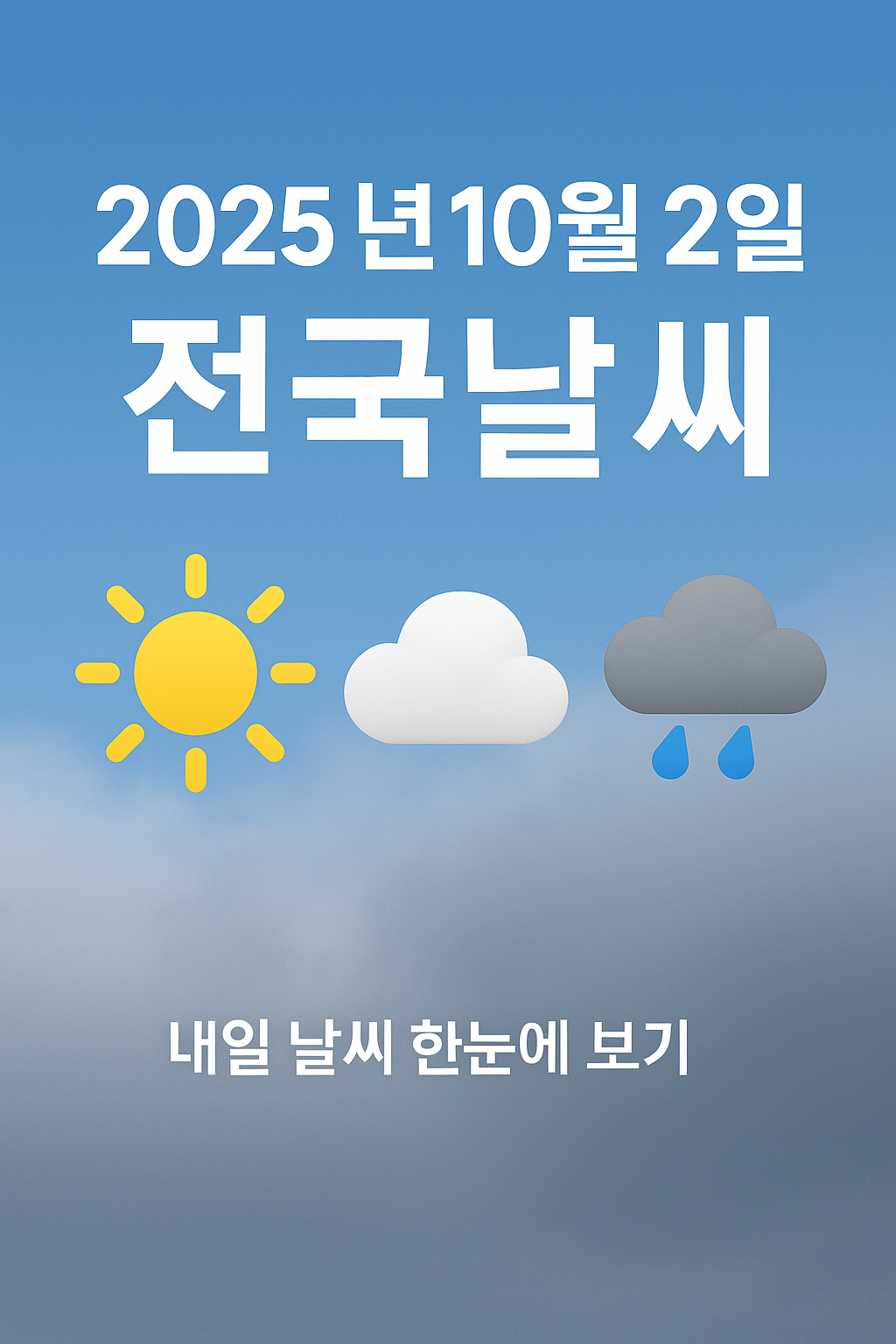 내일 10월 2일, 전국은 흐리고 비 소식이 이어집니다. 🌧️ 출근길과 귀갓길 모두 우산 준비가 필요할 전망인데요, 기상청과 케이웨더 자료를 기반으로 자세히 정리해드리겠습니다.