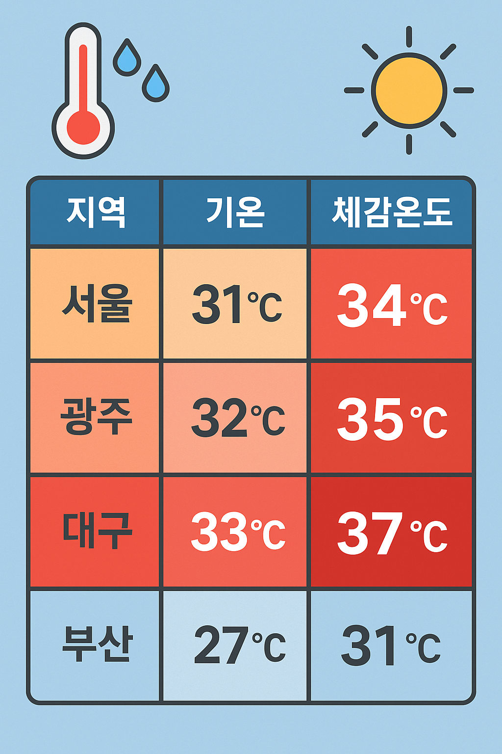 - 폭염주의보: 수도권, 강원, 충청, 전라, 제주 대부분