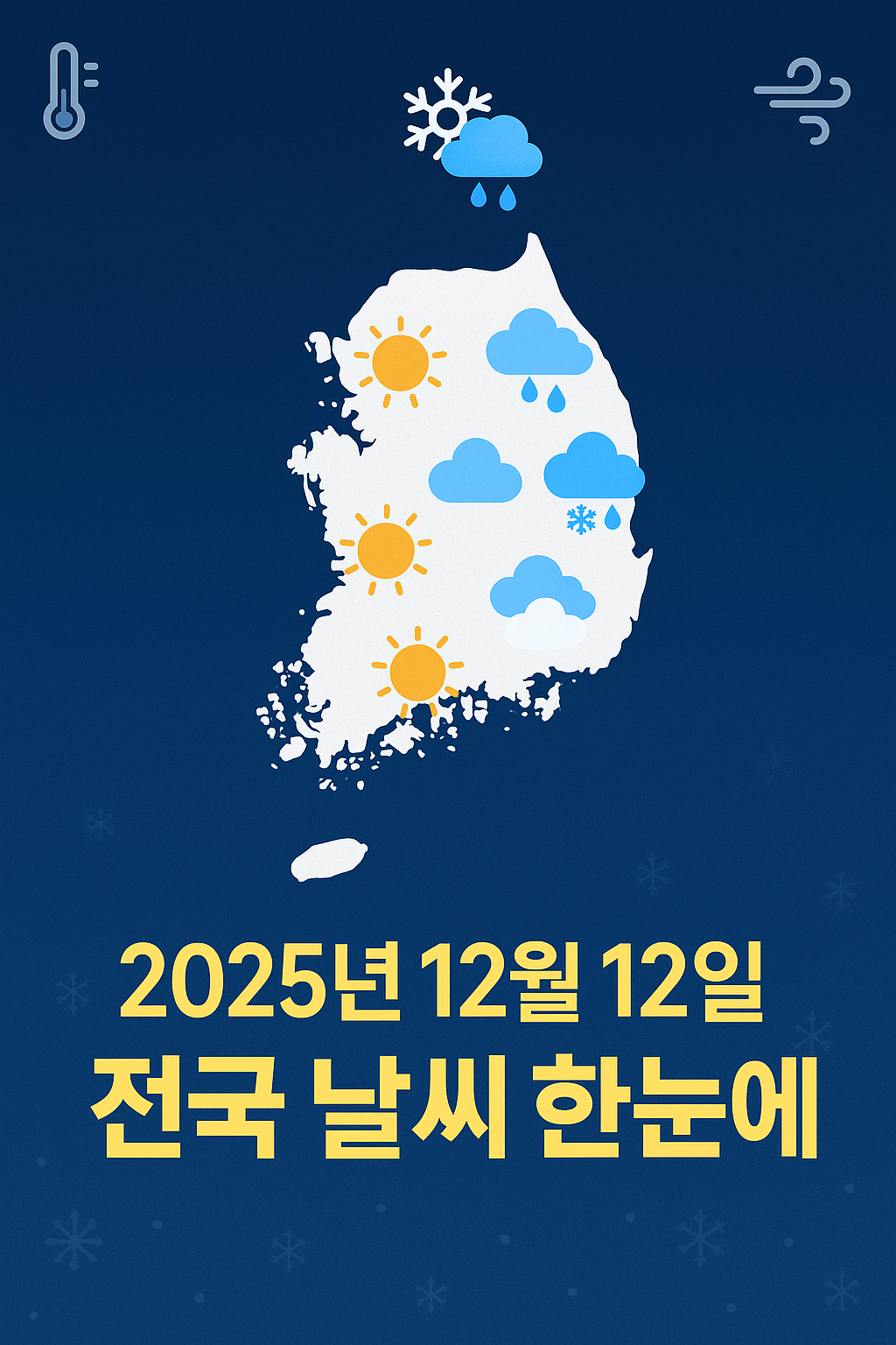 안녕하세요, 날씨정보 팬 여러분! 2025년 12월 12일 금요일은 전국 겨울 추위가 본격화되는 날이에요. 아침엔 영하권 가까운 쌀쌀함, 낮엔 5~11도 정도로 평년 비슷한 기온이 예상돼요.