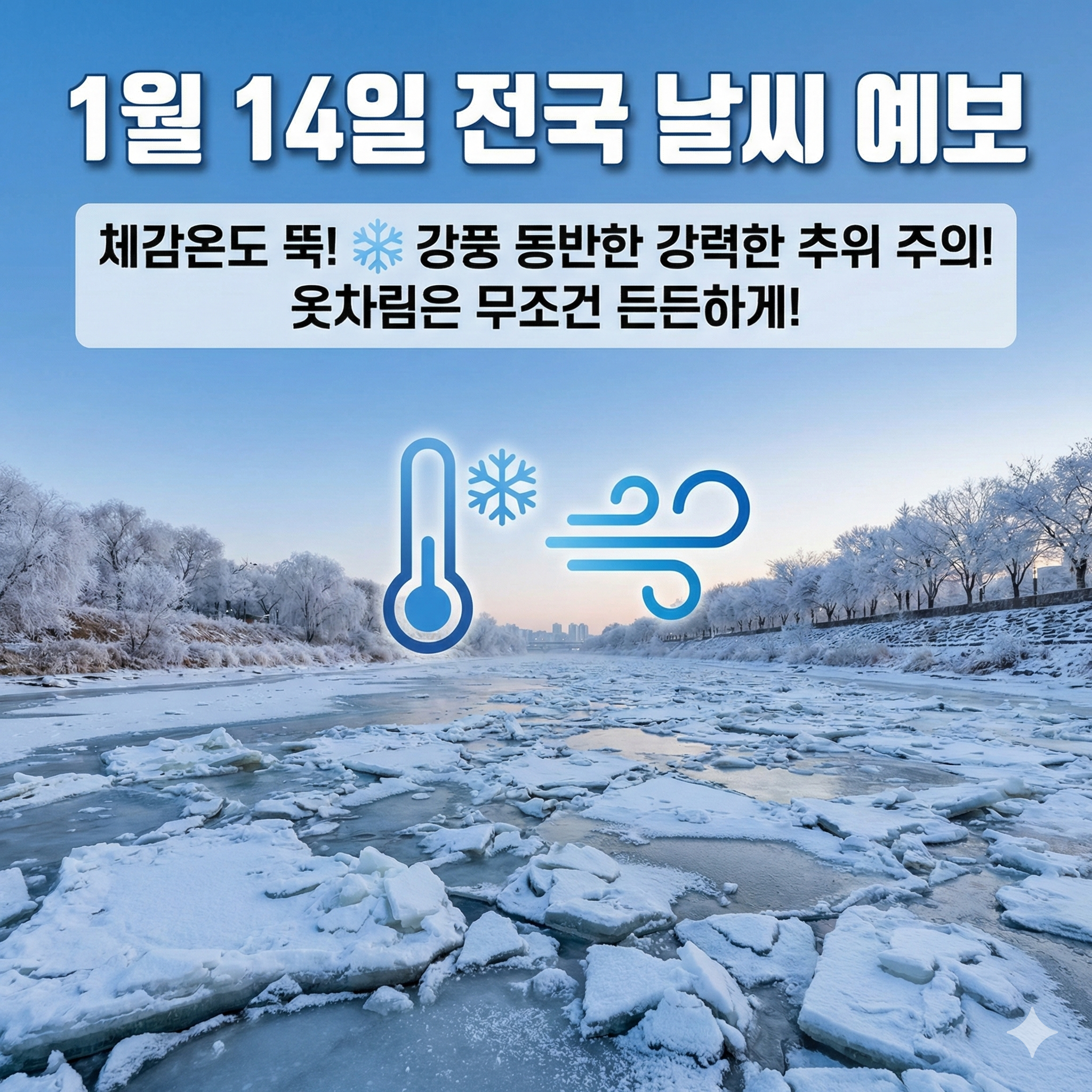 2026년 1월 14일 수요일은 중국 북부지방에서 확장하는 찬 대륙고기압의 영향을 본격적으로 받겠습니다. 전국이 대체로 맑겠으나, 기온이 급격히 떨어지며 강력한 한파가 몰아칠 것으로 보입니다. 🥶