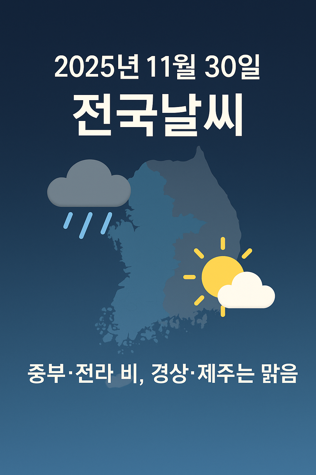 2025년 11월 30일 일요일에는 중부지방과 전라권은 구름이 많고, 일부 지역에는 비가 내리는 흐린 날씨가 이어지겠습니다.[web:3][web:21][web:22]