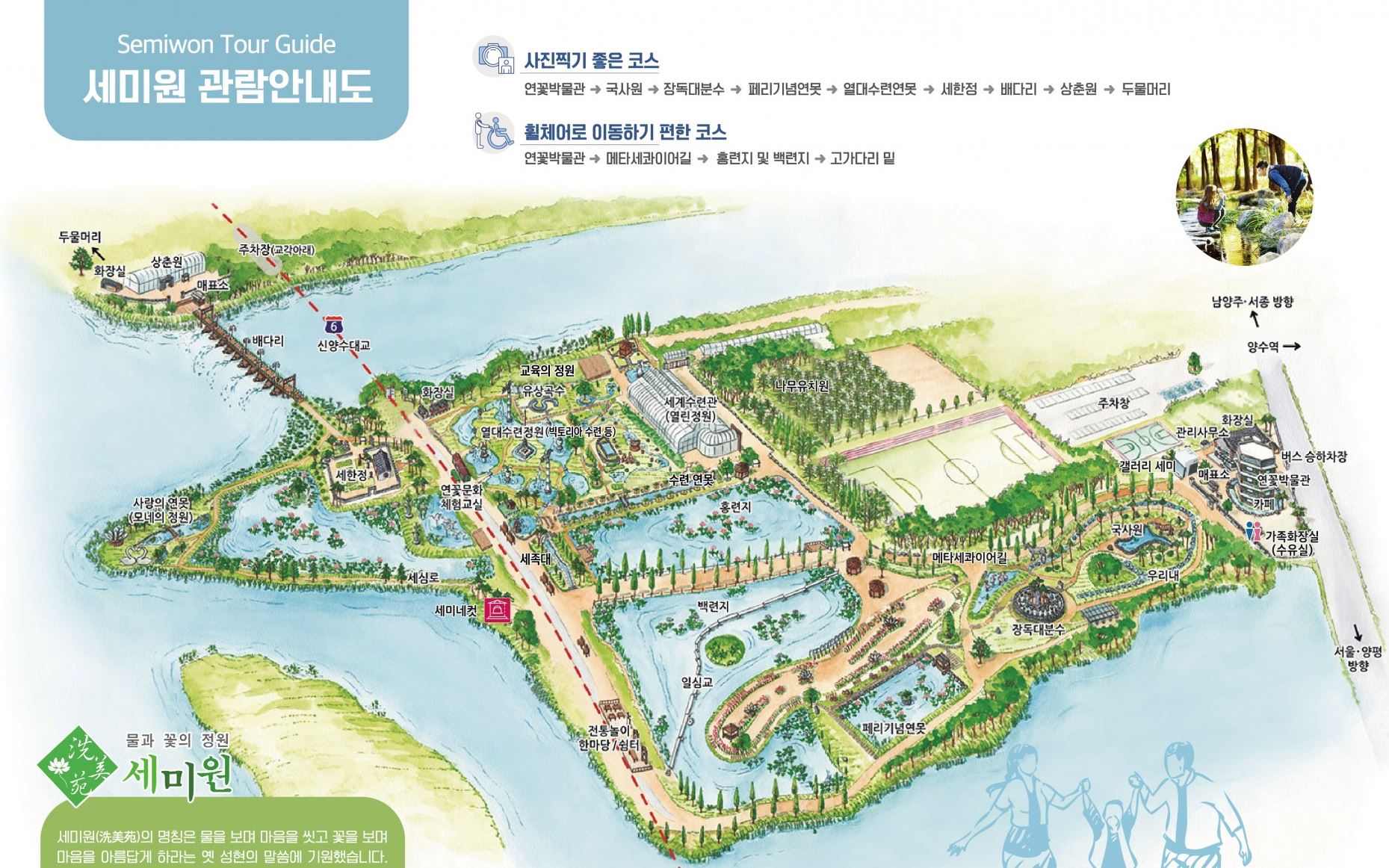 - 세미원은 6개의 연꽃 연못, 백련지(6,990㎡), 홍련지(5,037㎡), 사랑의 연목(3,300㎡) 등 다양한 테마 정원으로 구성