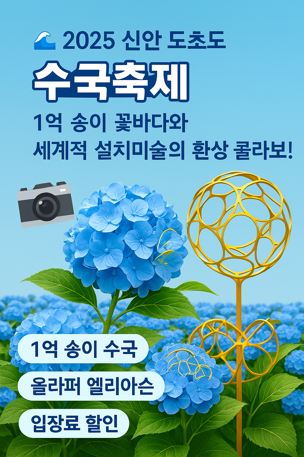 2025년, 신안 도초도는 1억 송이 수국과 예술이 어우러진 환상적인 꽃바다로 변신합니다.