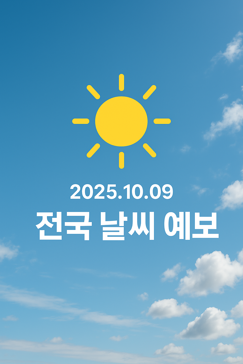 요약하자면, 2025년 10월 9일은 전국적으로 **대체로 맑고 안정적인 날씨**가 예상되며, 다만 **동해안·산지는 흐림 또는 약한 비 가능성**, **바람·파고 변화** 등 태풍 외곽 영향 대비가 필요합니다. 외출하실 땐 가벼운 겉옷 챙기시고, 해안가나 바다 근처는 실시간 기상 체크 잊지 마세요!