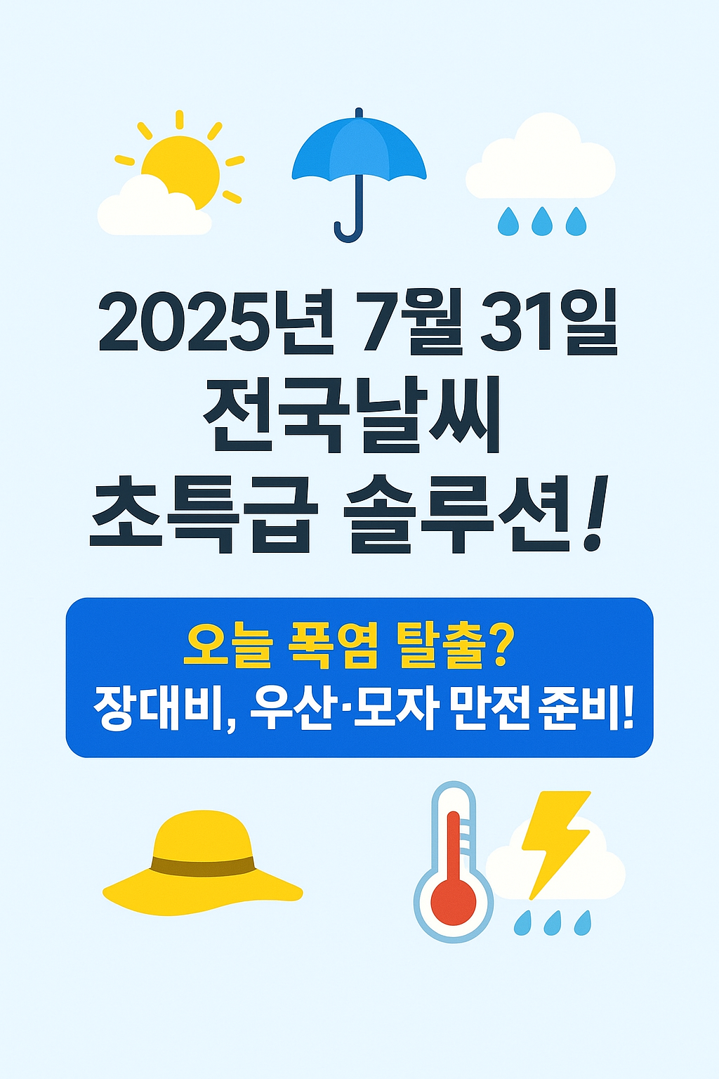 🌞 2025년 7월31일 전국 날씨 초특급 솔루션! 오늘 폭염 탈출? 장대비, 우산·모자 만전 준비! ☔️🧢