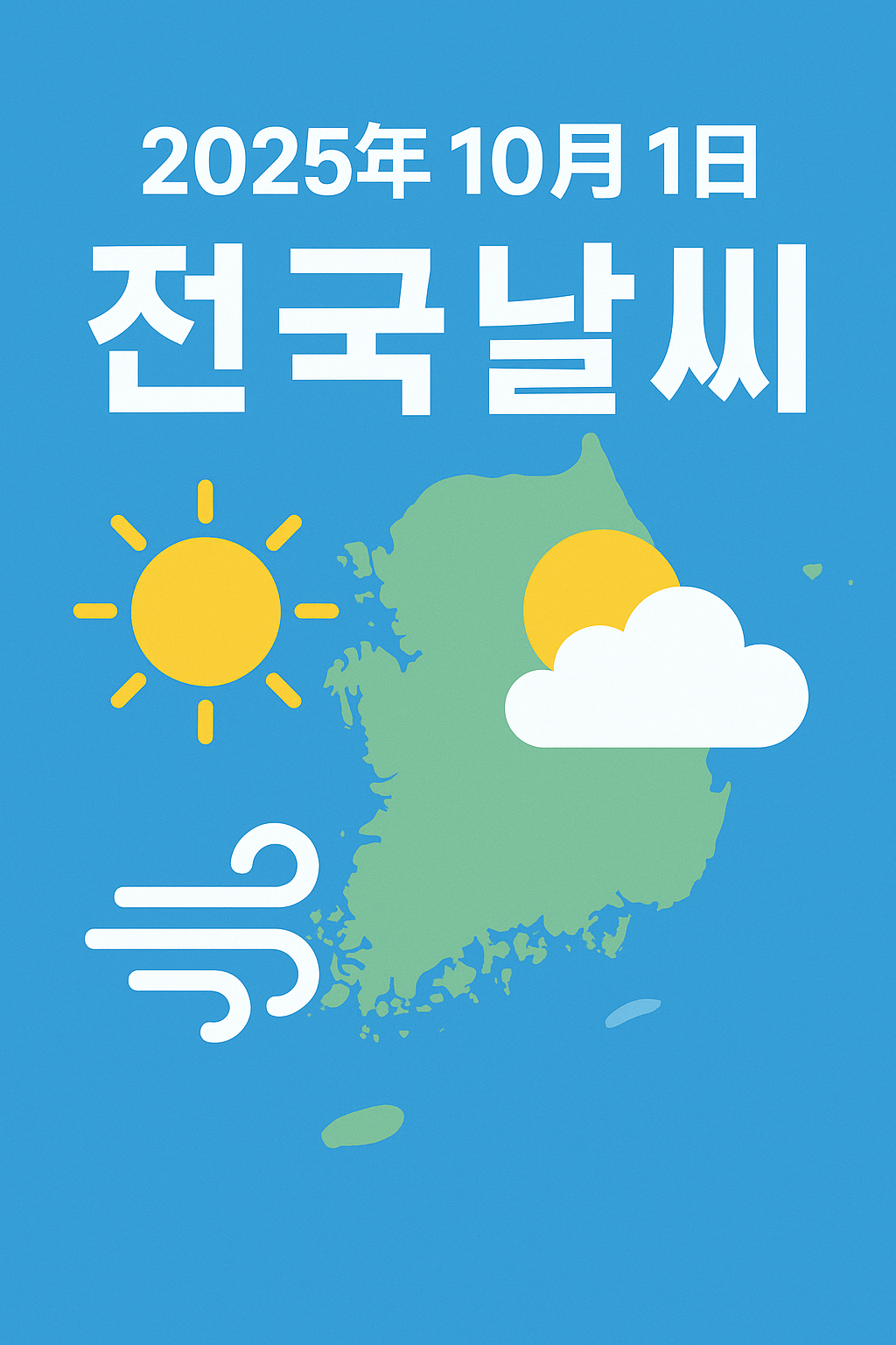 기상청 [날씨누리]와 케이웨더에 따르면, 10월1일은 전국이 대체로 맑은 날씨로 이어집니다. 중부, 남부, 제주 모두 높은 하늘이 예상되며, 일부 지역 아침 짙은 안개 우려가 있습니다.