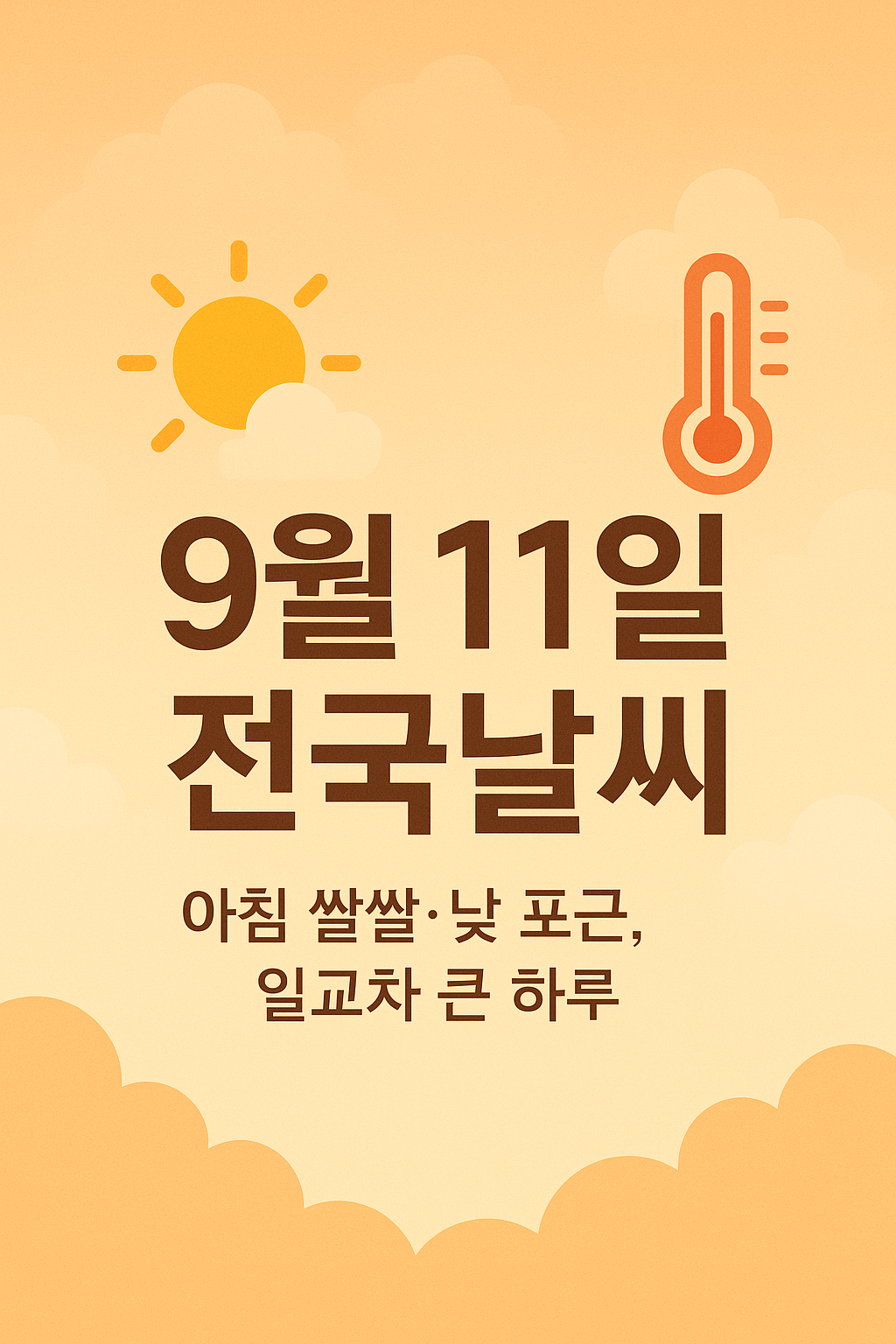2025년 9월 11일 전국 날씨는 **아침 기온이 14~18도**로 쌀쌀하게 시작되지만, 낮에는 24~28도까지 올라 포근한 가을 날씨가 이어지겠습니다. 다만, 일교차가 10도 이상 벌어지는 곳이 많으니 건강 관리가 필요합니다.