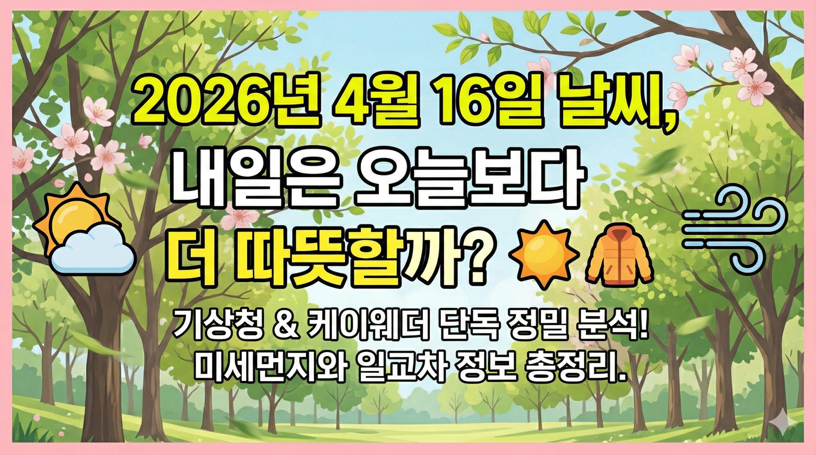 안녕하세요! 2026년 4월 16일 목요일, 기상청 날씨누리와 케이웨더의 최신 데이터를 바탕으로 전해드립니다. 오늘은 전국이 서해상에 위치한 고기압의 가장자리에 들어 가끔 구름 많은 날씨를 보이겠습니다.