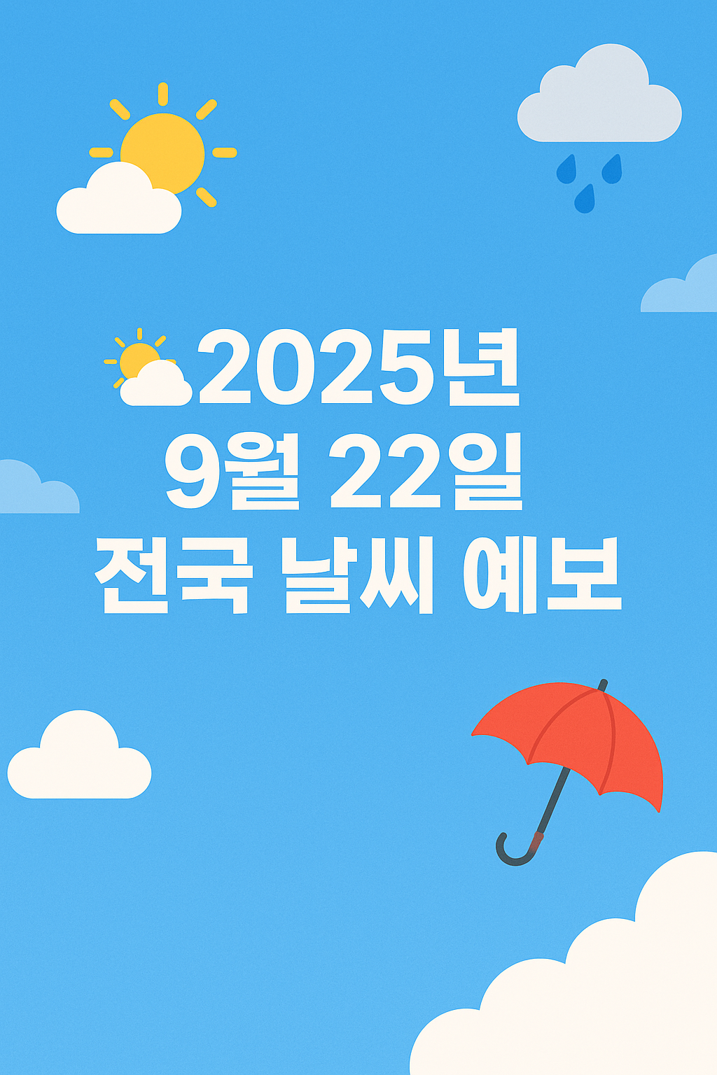 2025년 9월 22일 월요일, 기상청과 케이웨더의 예보에 따르면 전국은 대체로 맑음이 예상됩니다. 강원 영동과 제주도는 구름많음과 함께 산발적으로 비(강수 확률 30~40%)가 내릴 수 있습니다. 아침 기온은 16℃ ~ 21℃, 낮 기온은 24℃ ~ 29℃로 일교차가 큰 날씨가 예상됩니다.