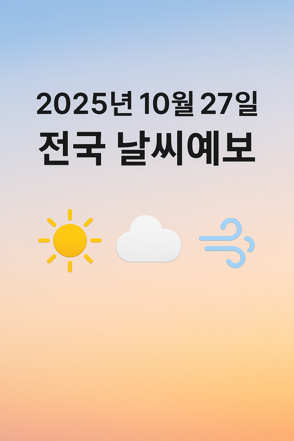 2025년 10월 27일 월요일, 기상청 발표에 따르면 아침 기온이 크게 떨어질 것으로 보입니다. 아침에는 전국 대부분 지역에서 **2 ~ 10 ℃**까지 내려가겠고, 낮 기온은 **12 ~ 19 ℃**로 예상되어 평년보다 다소 낮겠습니다.