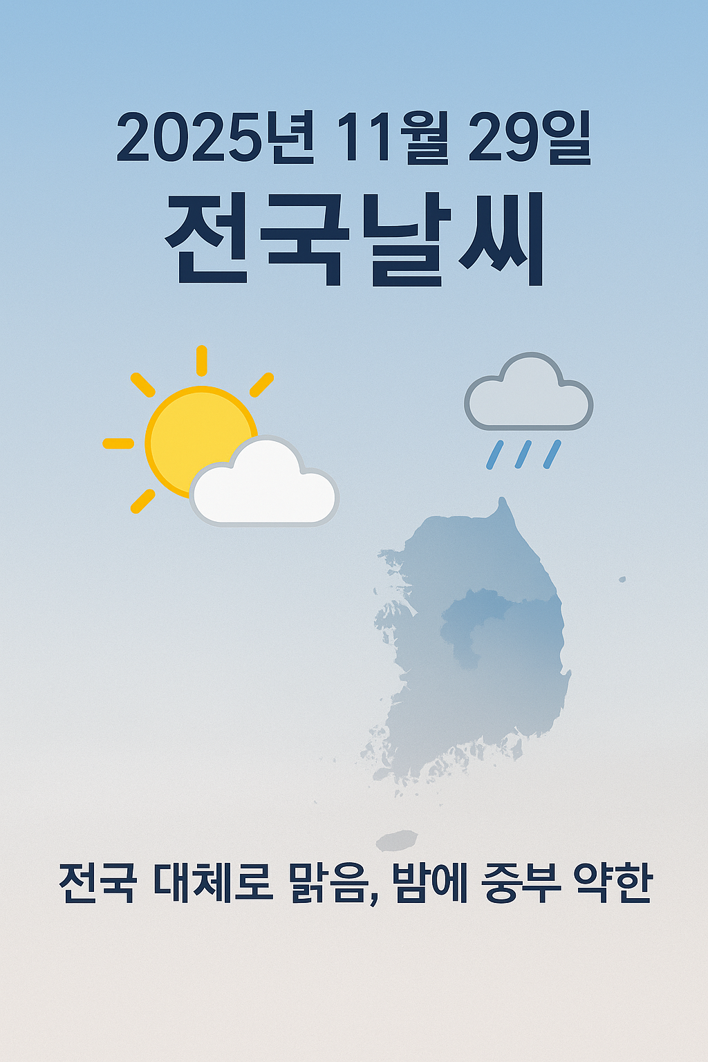 2025년 11월 29일 토요일은 전국이 대체로 맑은 편이지만, 중부지방은 오후부터 점차 흐려지고 밤에는 경기북부·강원영서북부에 약한 비가 예상됩니다.[web:13][web:19]