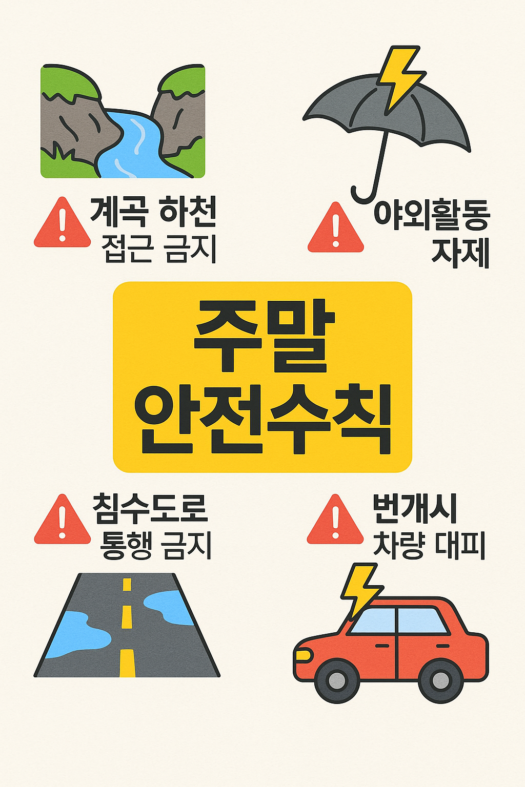- 야외활동 주의: 계곡, 하천, 저지대 침수 위험! 갑자기 물이 불어날 수 있음