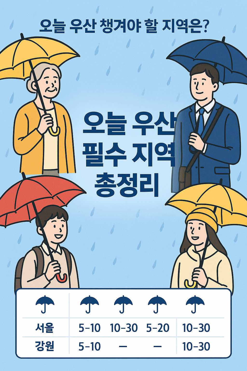 A2. 수도권, 강원, 충청, 전라, 경상, 제주 대부분 지역에서 우산이 필요합니다. 특히 오전~밤까지 비가 이어질 수 있으니 꼭 챙기세요.