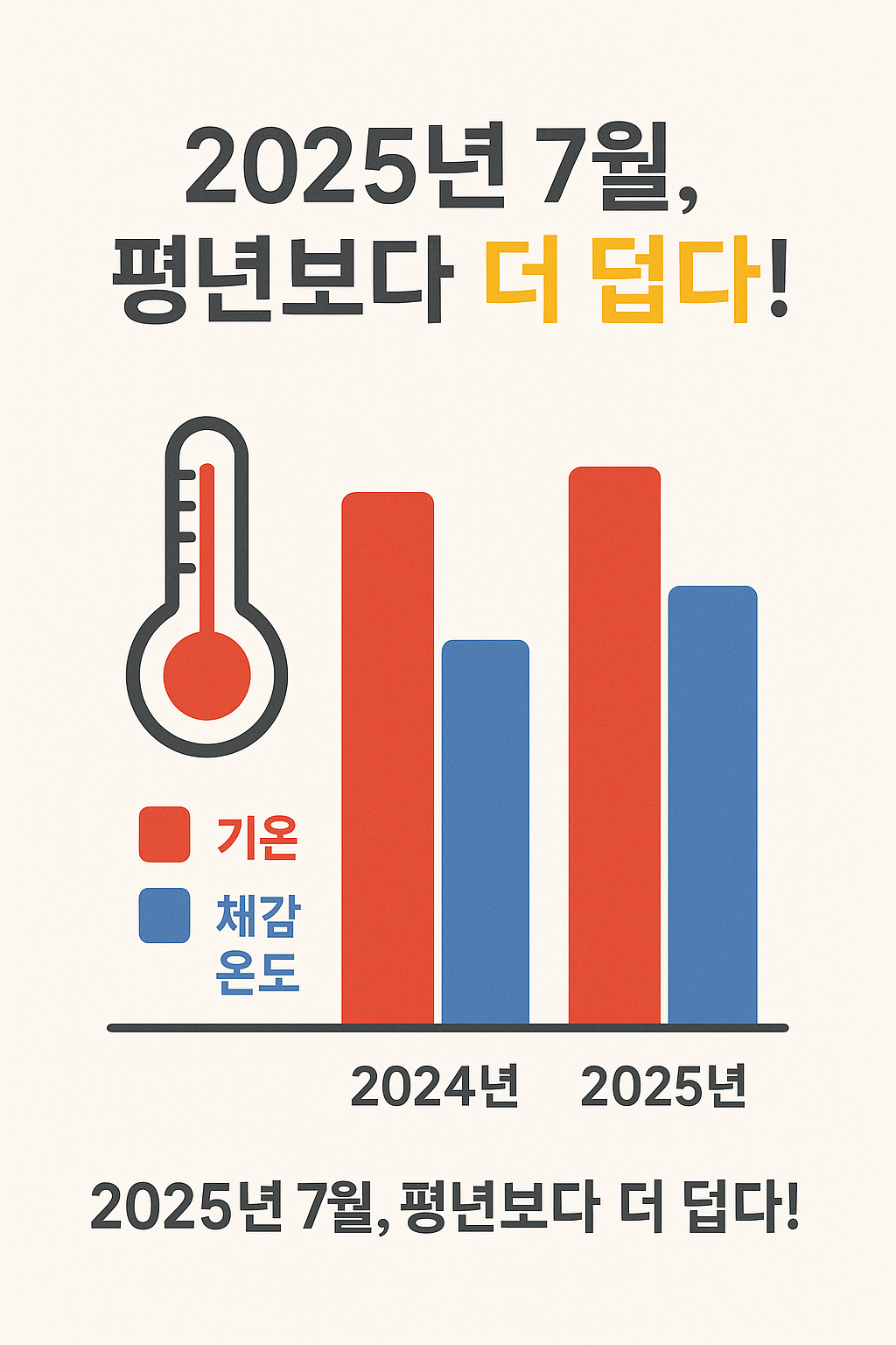 2025년 7월은 평년(24.9~25.5℃) 대비 1~2도 높은 무더위가 확실시됩니다.