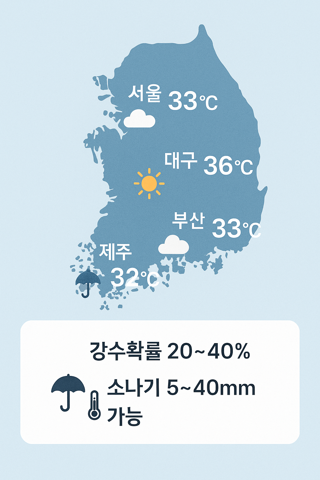 | 서울 | 26 | 33 | 구름많음/소나기 | 40 |