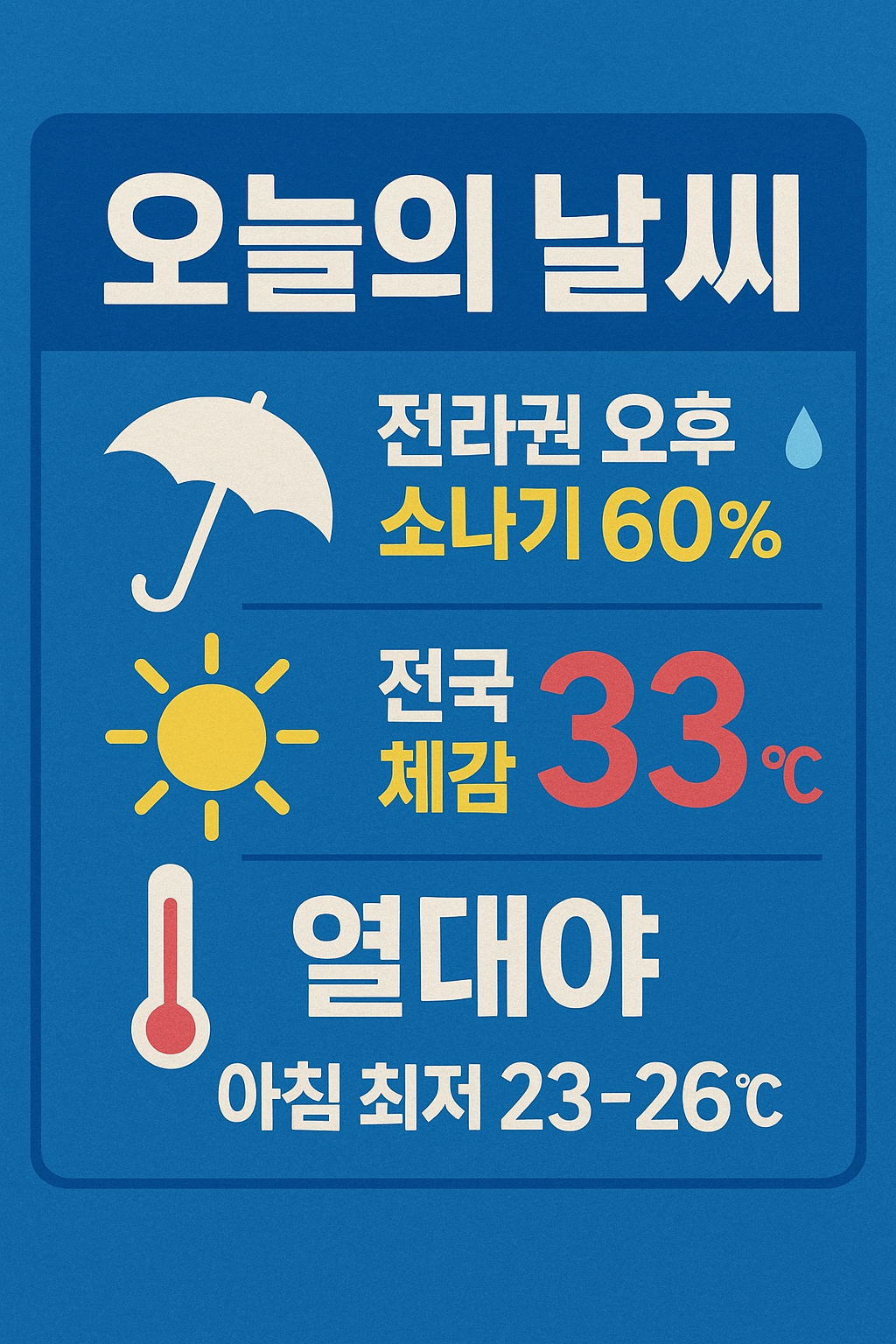 - 우산 챙기기: 전라권(광주, 전북 등) 오후 소나기 확률 60%로, 외출 시 우산 필수!