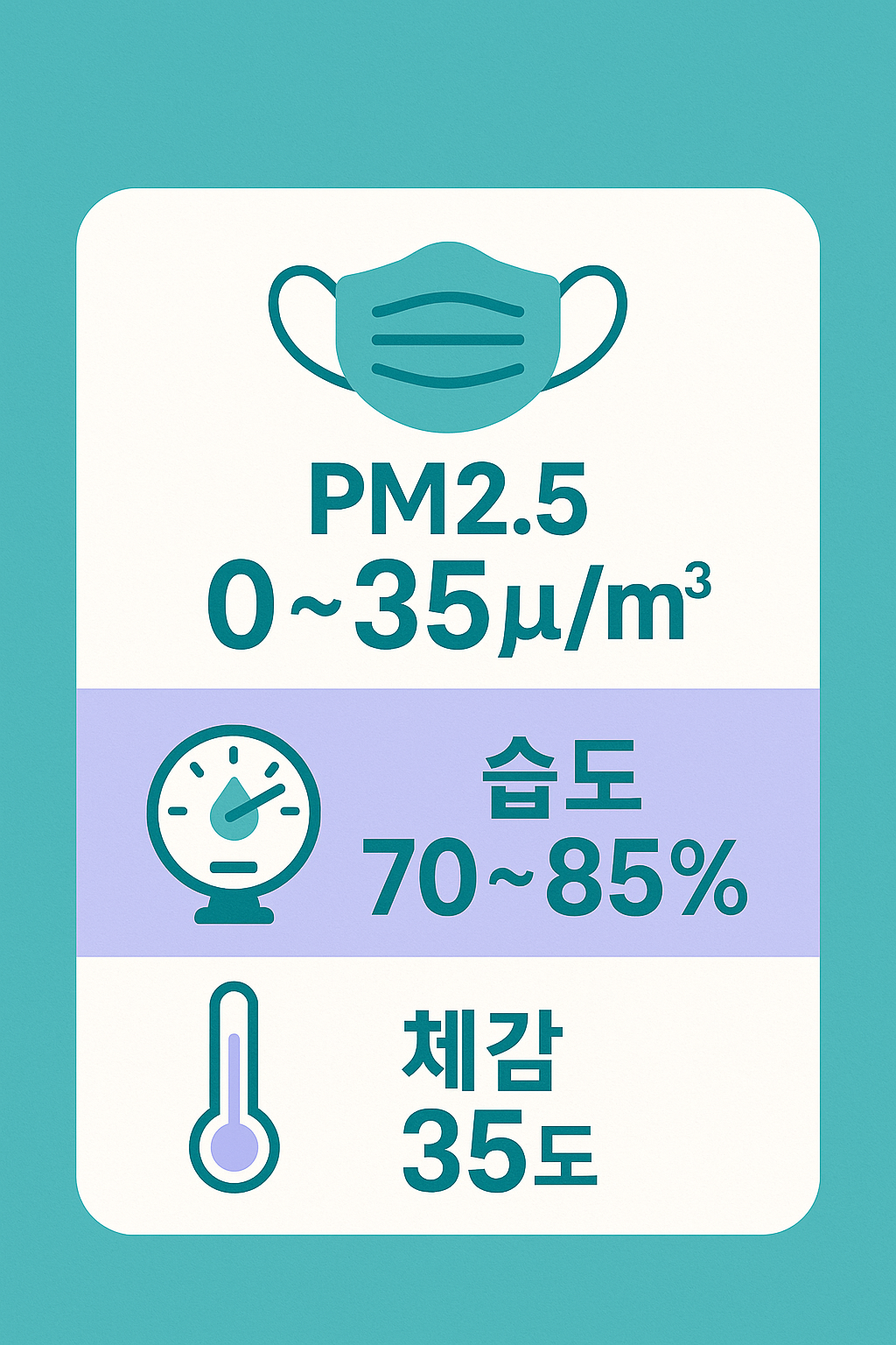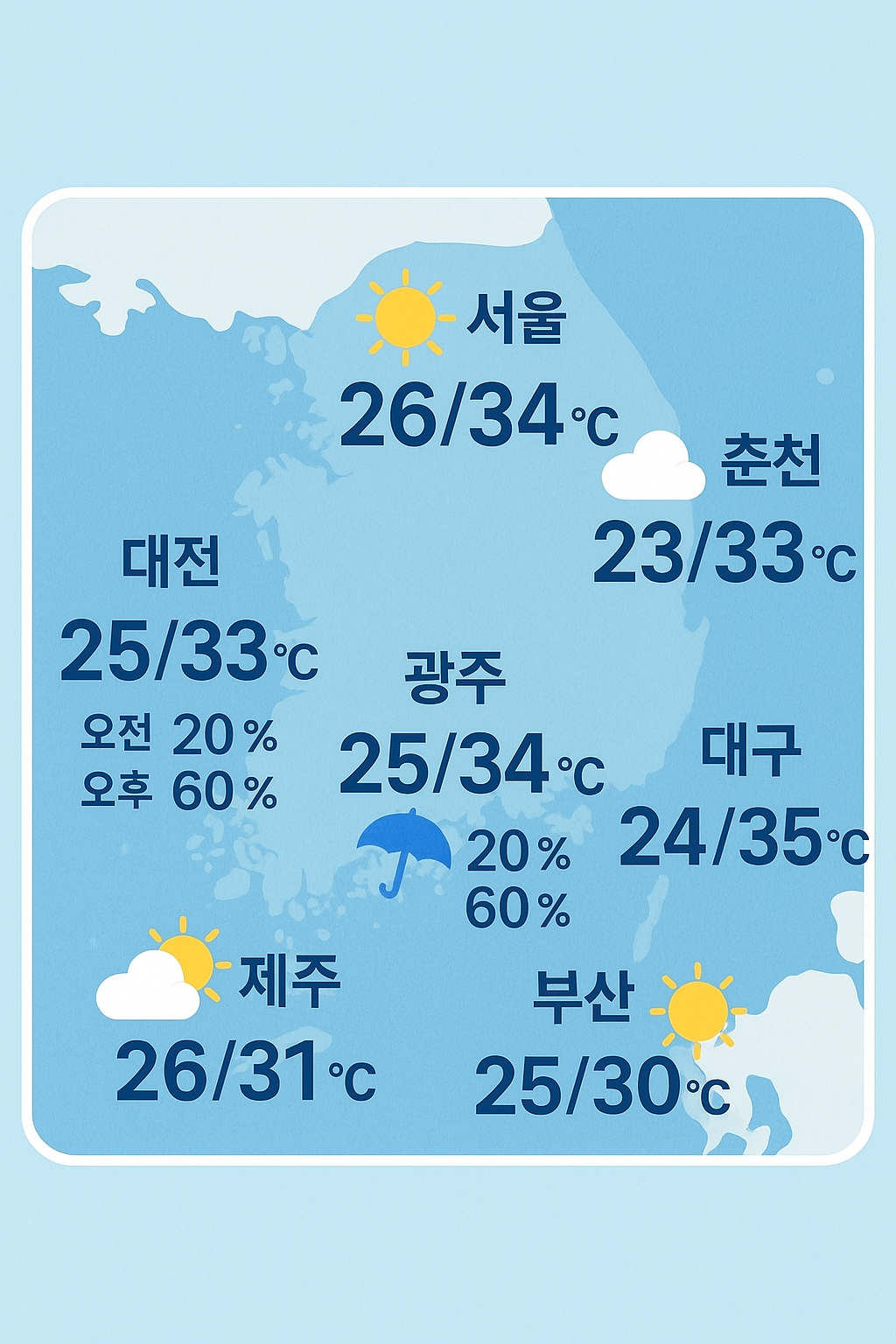 - 체감온도: 실제 기온보다 2~3도 높게 느껴질 수 있음. 서울·대구 등 내륙은 35도 이상 체감.