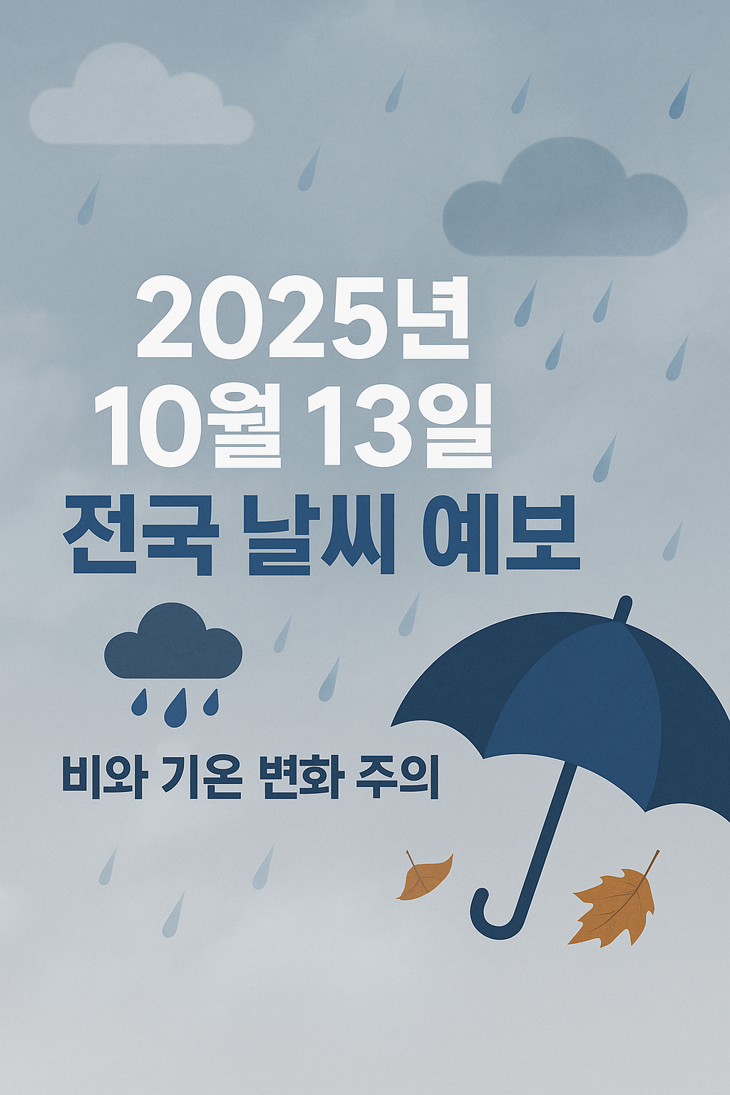 2025년 10월 13일(월)은 전국 대부분 지역에 **가끔 비가 내리는 흐린 날씨**가 예상됩니다. 기상청 중기예보 발표문에 따르면 “오늘과 내일은 전국 대부분 지역에 **가끔 비**가 내리겠다”는 전망이 포함되어 있습니다. :contentReference[oaicite:0]{index=0} 케이웨더 단기예보도 동일하게 비 예보를 제시하며, 최고기온과 최저기온을 18℃ / 16℃로 안내합니다. :contentReference[oaicite:1]{index=1}