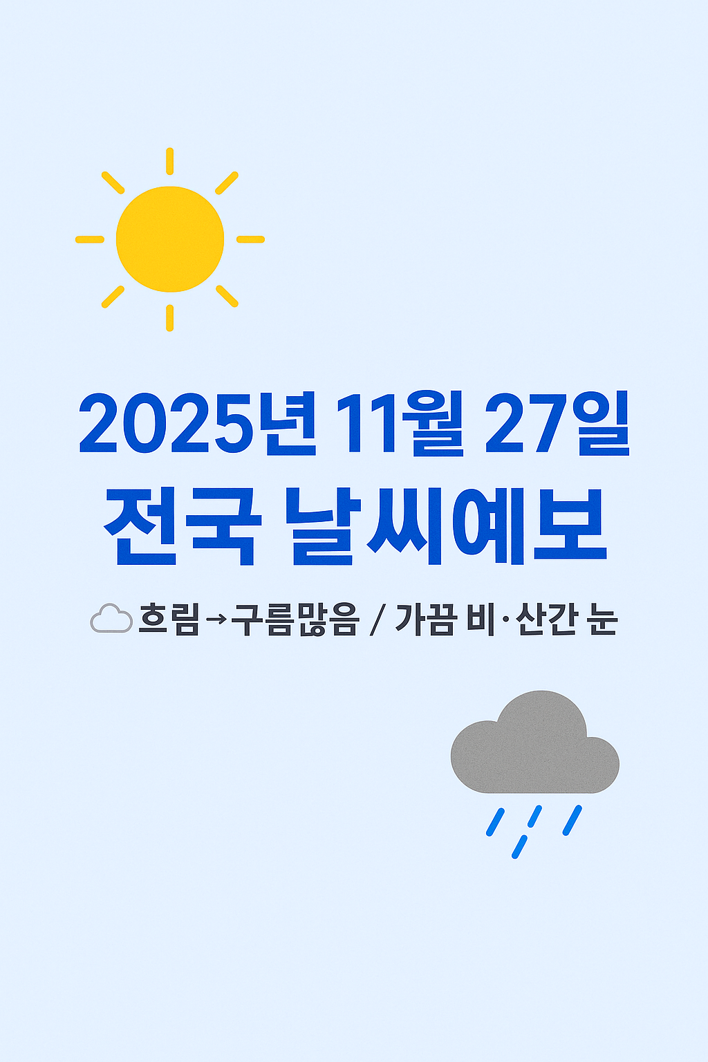 안녕하세요! 다가오는 11월 27일(목요일) 전국 날씨를 미리 살펴볼게요. 이날은 전국적으로 흐림에서 시작해 늦은 오후에는 구름이 많이 끼는 흐름이 예상됩니다. 아침 시간대부터 강원산지 및 남부 고지대에 비 또는 눈이 일부 예보되어 있어요. 이후 밤 사이 대부분 지역에서 그칠 가능성이 커요.