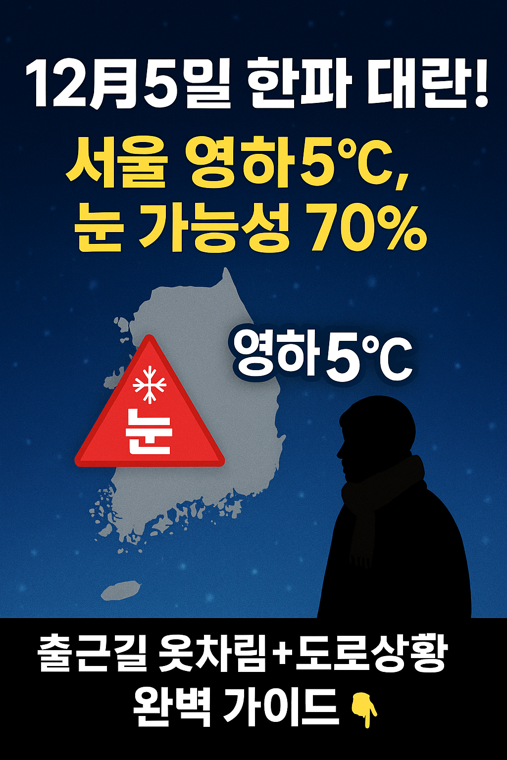 서울 기준 12월 5일은 최저 -5℃, 최고 3℃ 수준의 예보 흐름이 이어져, 두꺼운 코트 + 목도리 + 장갑까지 모두 챙기는 것이 좋겠습니다.