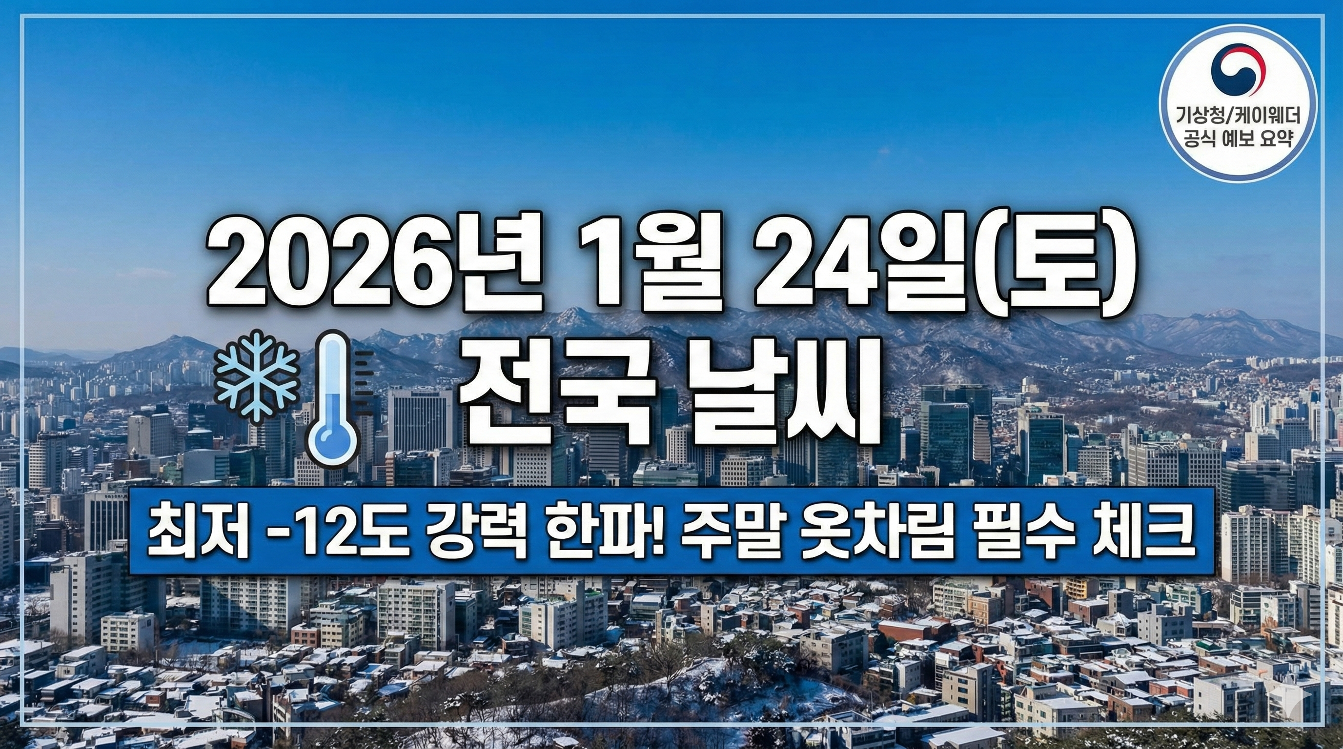 안녕하세요! 여러분의 주말을 책임질 날씨 요정입니다. 😇 2026년 1월 24일 토요일은 기상청 날씨누리와 케이웨더 예보에 따르면, 찬 대륙고기압의 확장이 정점에 달하며 전국적으로 매서운 한파가 이어질 전망입니다.