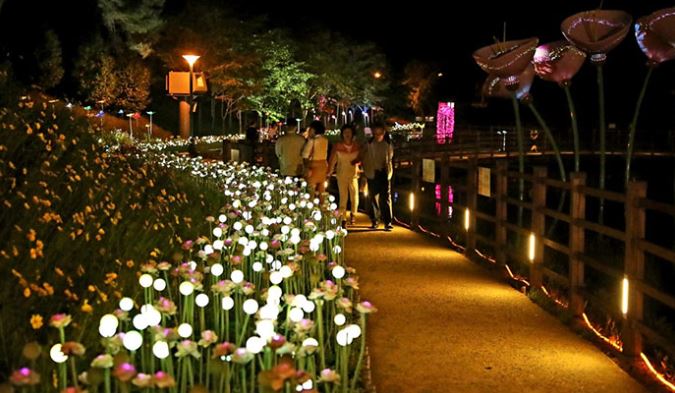 A4. 해가 진 뒤(오후 7시~)부터 장미원 곳곳에서 환상적인 조명과 불꽃쇼를 감상할 수 있습니다.