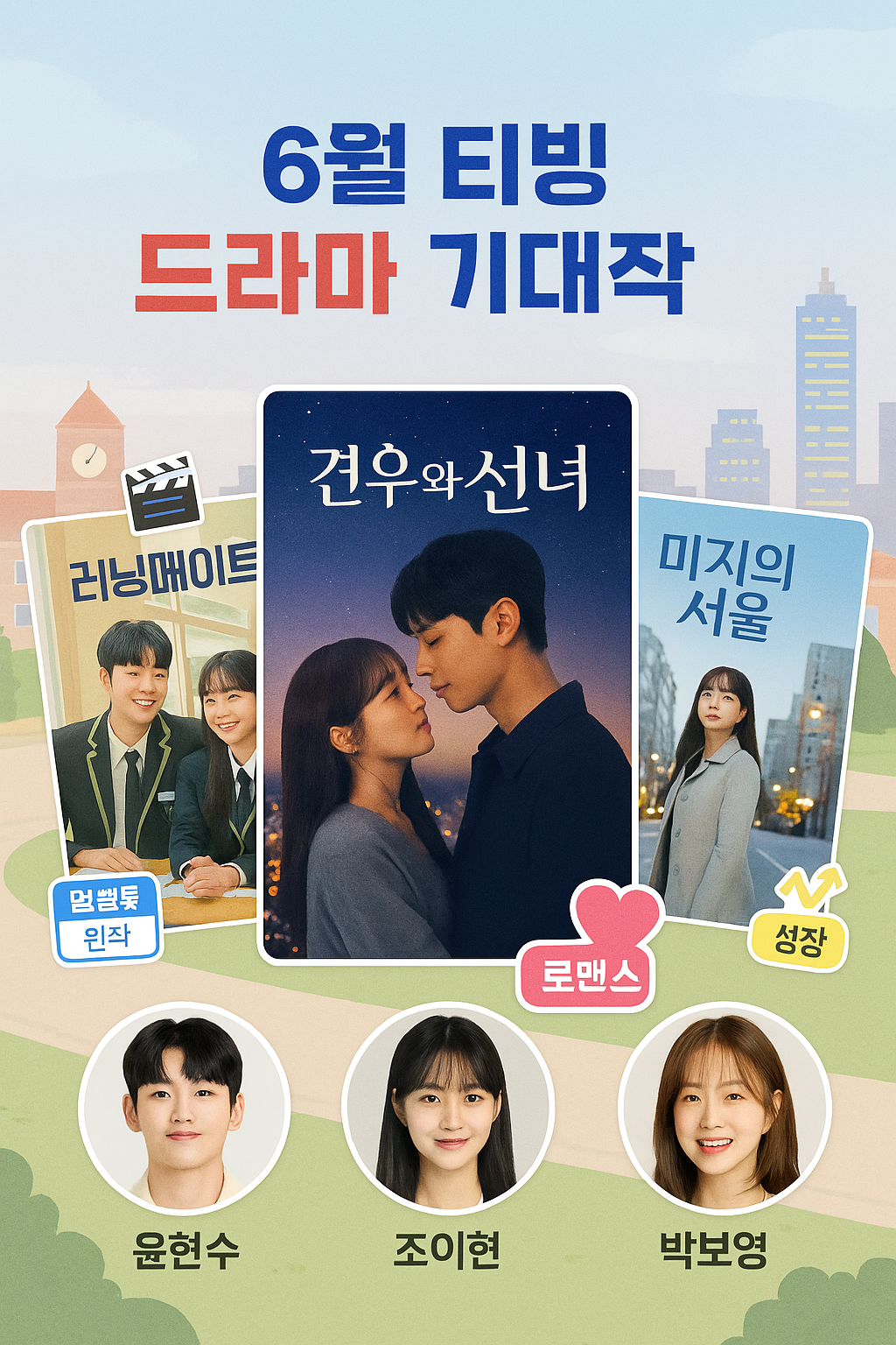 A1. ‘러닝메이트’(6/19), ‘견우와 선녀’(6/23), ‘에코 밸리’(6/13) 등 기대작이 많아요! 청춘 성장·로맨스·글로벌 드라마 모두 추천!