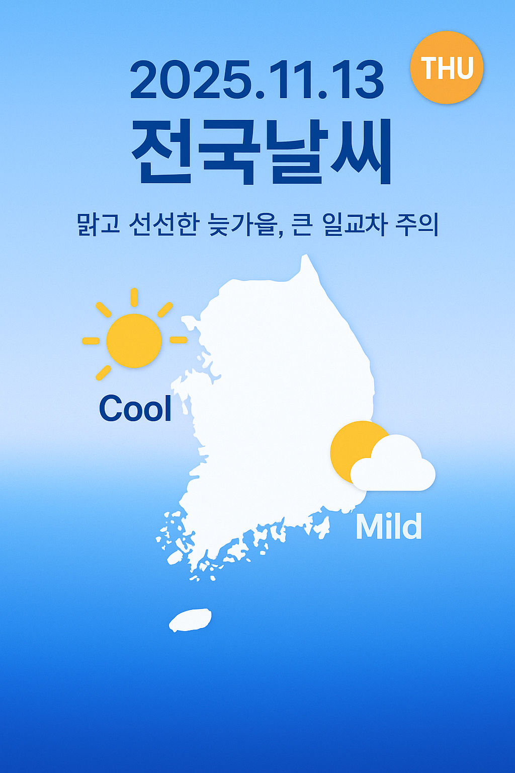 2025년 11월 13일 전국 날씨는 “아침 쌀쌀, 낮 온화, 대체로 맑음”이라는 한 문장으로 정리할 수 있습니다.