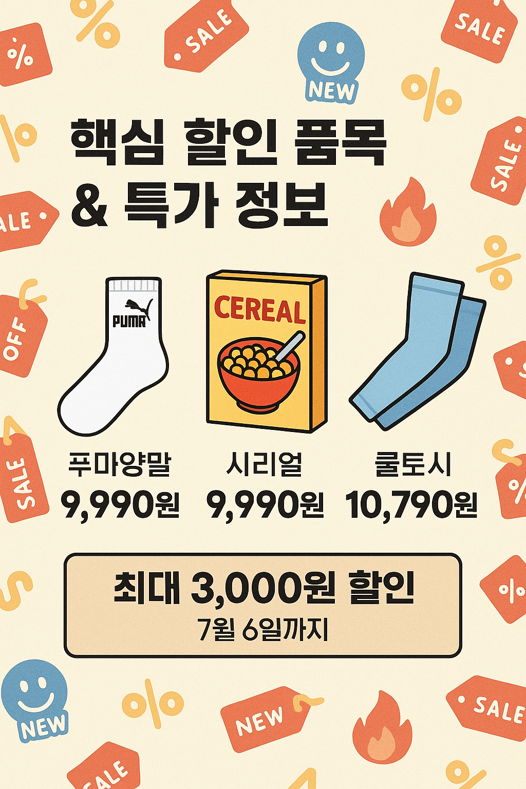 - 온라인몰: 푸마 양말, 시리얼, 수정테이프 등 일상 필수템 위주 할인[1].