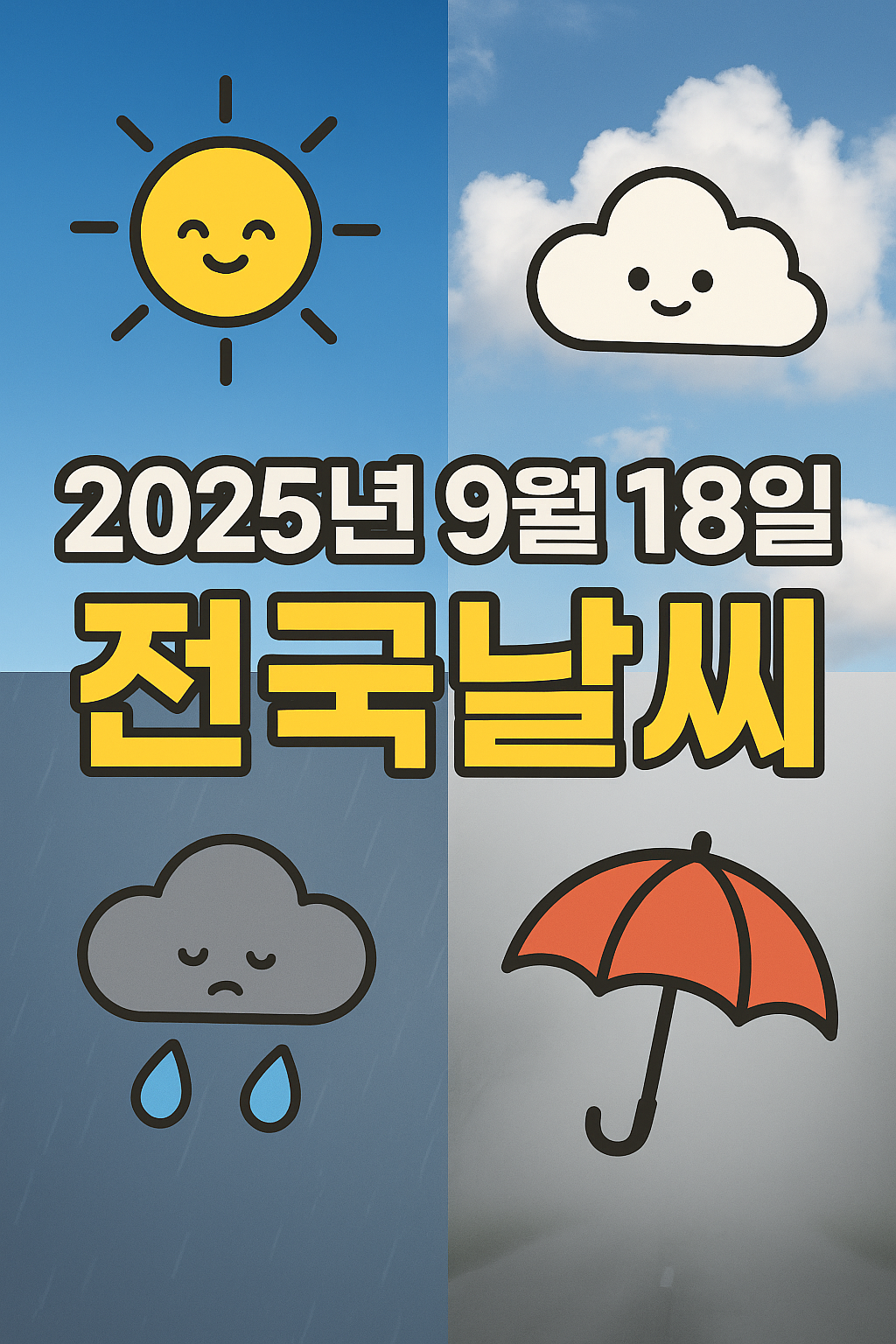 안녕하세요! 오늘은 2025년 9월 18일 전국 날씨 소식을 전해드립니다. 본 정보는 반드시 기상청 날씨누리와 케이웨더의 데이터를 기반으로 작성되었습니다.