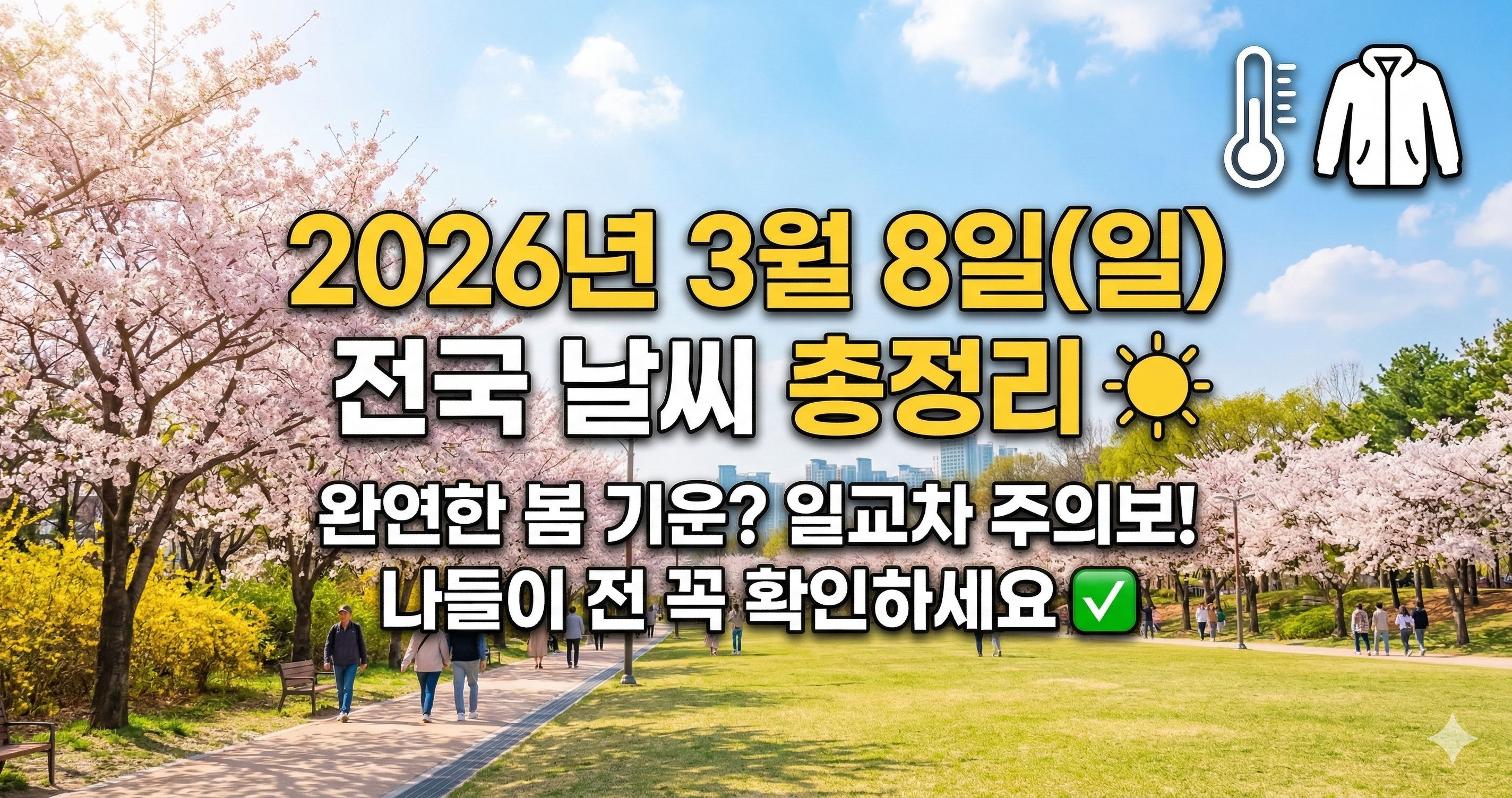 안녕하세요! 즐거운 주말 보내고 계신가요? 😊 오늘은 주말의 마무리인 2026년 3월 8일 일요일 전국 날씨를 꼼꼼하게 전해드리려고 합니다. 기상청 날씨누리와 케이웨더의 최신 데이터를 바탕으로 완벽 분석해 보았으니, 나들이 가시기 전 꼭 읽어보세요!