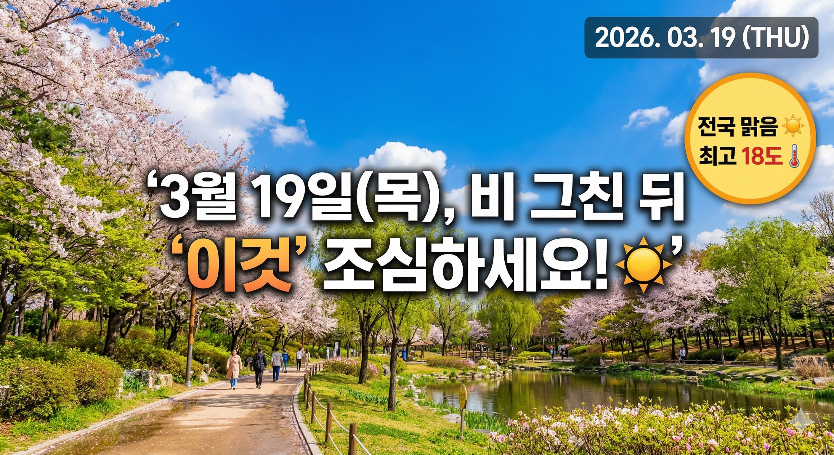 안녕하세요! 어제 내린 비로 공기가 한층 맑아진 2026년 3월 19일 목요일입니다. 😊 기상청 날씨누리와 케이웨더의 최신 분석에 따르면, 오늘은 서해상에서 동진하는 고기압의 영향을 받아 전국이 대체로 맑고 쾌청한 하늘을 보일 것으로 예보되었습니다.